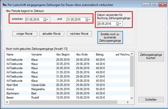 Über die Auswahl eines Zeitintervalls für den Start einer Abo-Periode erhalten sie alle anstehenden Zahlungen. Aus der Liste können sie bei Bedarf Einträge löschen, indem sie diese selektieren und Entf-Taste drücken. Danach können sie die Zahlungseingänge per Klick auf den Zahlungseingänge buchen Button erzeugen. Der Zeitpunkt für den Zahlungseingang ist über das Feld Datum verwenden für Buchung Zahlungseingänge wählbar. Die erzeugten Zahlungseingänge erhalten dieses Datum.