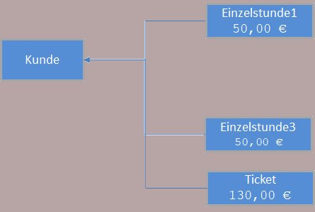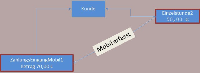 Die Einzelstunde kostet 50,00 €, da sie beim Kunden zu Hause erfolgt, wird zusätzliche eine Anfahrtspauschale von 20,00 € erhoben. Die Situation nach Erstellen der Einzelstunde (im Mobile Client 2 über Einzelstunden->+ erstellt) und des Zahlungseingangs von 50,00 € + 20,00 € = 70,00 € ist in der folgenden Skizze dargestellt: