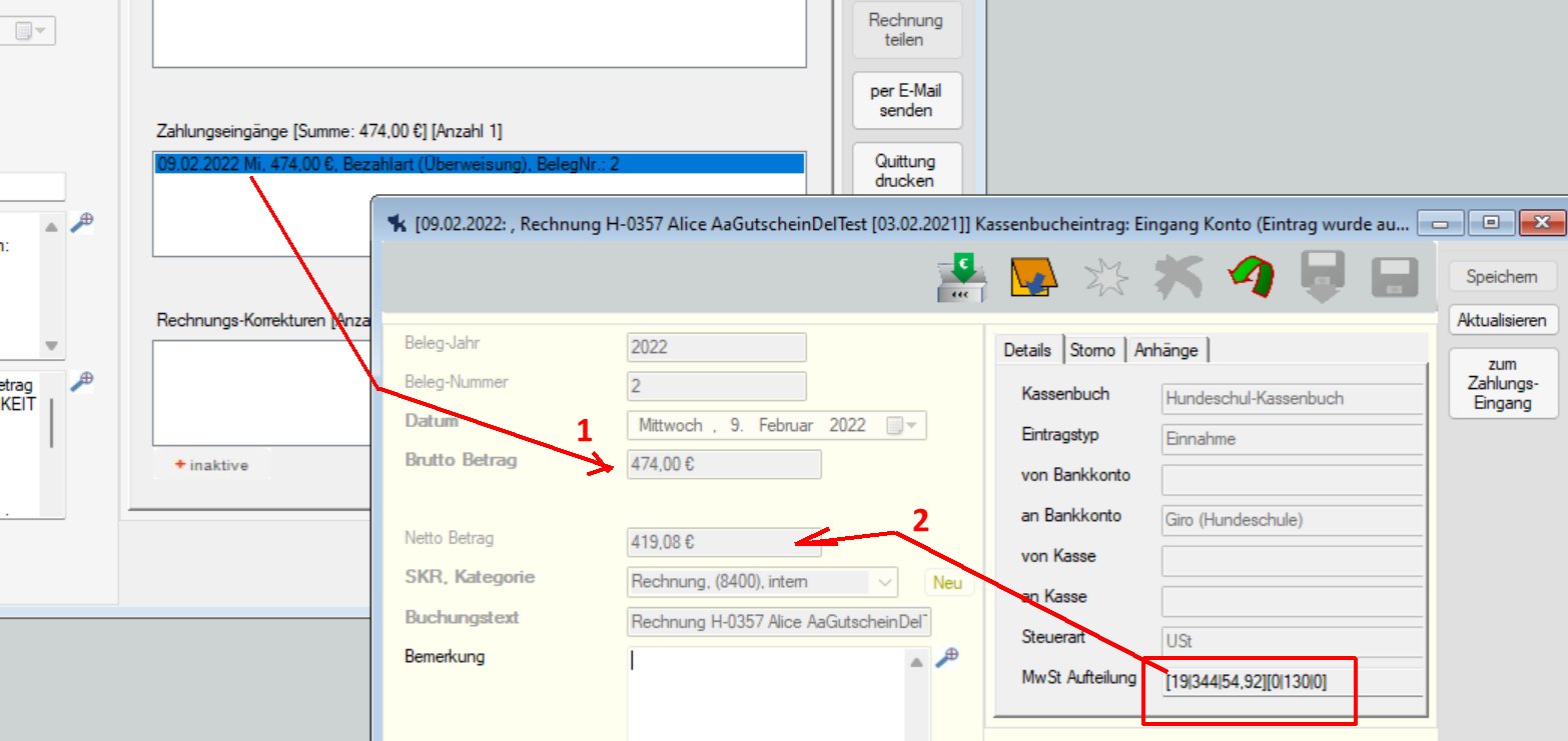 In KnoWau ist jedem Zahlungseingang ist ein Kassenbucheintrag zugeordnet. Der Zahlungseingang dokumentiert nur den Bruttobetrag. Die Aufteilung des Bruttobetrages in Nettobeträge mit den jeweiligen MwSt-Sätzen geschieht im zugehörigen Kassenbucheintrag.