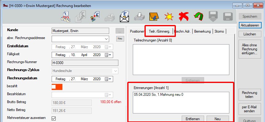 Alle Zahlungserinnerungen zu einer Rechnung werden im Reiter Teilr./Erinnerg. in der Bearbeitungsmaske der Rechnung angezeigt.