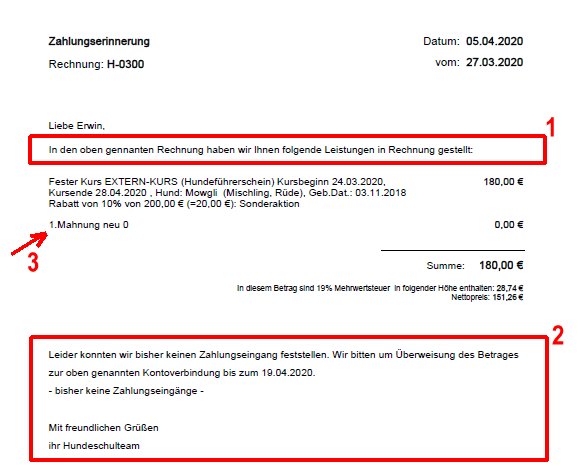 Die Mahngebühren (3) werden, falls ausgewählt, in die Rechnung aufgenommen und erscheinen - zusätzlich zu den ursprünglichen Rechnungsposition - in der Zahlungserinnerung.