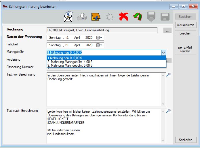 Per Doppelklick gelangt man zur Bearbeitungsmaske der Zahlungserinnerung oder mit Klick auf den Neu Button zur leeren Bearbeitungsmaske für eine neue Zahlungserinnerung: